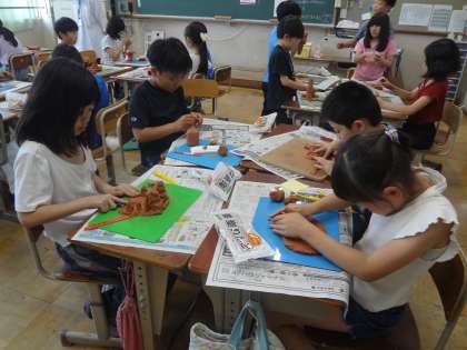 立ち上げた形にへらやかきべらを使って、工夫をこらしていました。「こんなのできたよ」「先生、見てみて」と作った作品に満足している子どもたちでした。