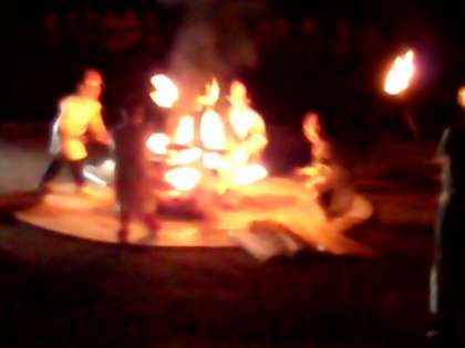 火の神様と火の子が点火し,大きな炎をみんなで囲みました。