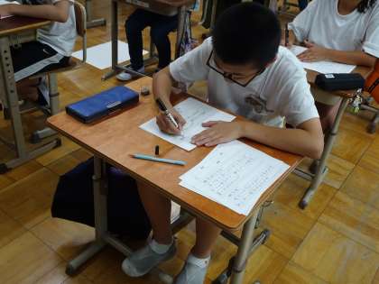 書写の学習では、硬筆で文字の大きさと配列に気をつけて『枕草子』を書きました。一つひとつの字にとめ・はね・はらい、そして配列を意識しながら集中して取り組みました。教室はいつも以上に「シンッ」と静まり、とても良い雰囲気で取り組むことができました。