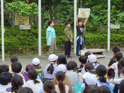 7時からは、一緒に宿泊している春日野小学校・葛野小学校との合同の朝の集いでした。桂坂小学校からは学校のキャラクターの「かざらっこ」の紹介や、いろいろな行事の紹介をしました。みんなで体操もしました。