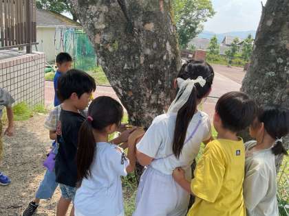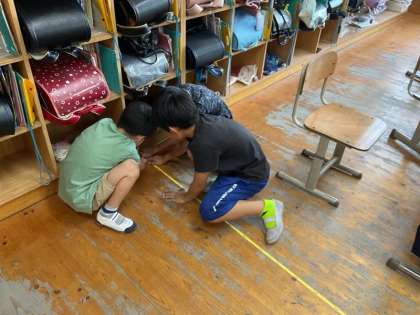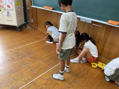 巻尺の使い方を学習し、長い長さや丸いものを測ることができると知りました。早速教室のたてと横の長さや、運動場の大きな木の周りの長さを測ってみました。