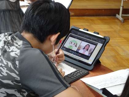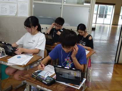 外国語の学習では「Let's see the world」の単元で、自分の行ってみたい国を紹介するために学習をすすめています。紹介するためには、世界のことについて知らないといけません。いろいろな国の食べ物や世界遺産などについて調べ、その言い方などを練習しています。写真は、一人一台タブレットを活用し、イヤホンを使いながらスペインについて紹介している動画を見て聞いて分かることをメモしている時のものです。