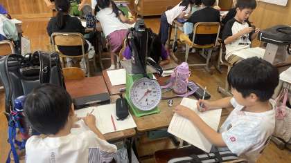 1kg=1000gと学んだ子どもたちは、「長さの単位みたい!」や、「問題が何kg何gと聞かれているから、1000g以上のものを見つけないと!」、「2kgのはかりだから、僕の重さははかれない」など、これまでの学習してきた内容につなげて考えたり、自分で考えて答えを導き出している姿が大変素敵です。