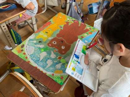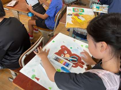図工の「言葉から感じて」の学習では、お話を聞いてその場面を想像して絵に表現する学習をしています。コンテや絵の具、クレパスを使ってきめ細かく色付けをしたり、お話の主人公であるくまの毛並みまで表現したりと、自分たちが心に残った場面を画用紙に思いっきり描いています。どの絵も今にも動き出しそうな、絵の中にいる動物の会話が聞こえてきそうなわくわくする絵に仕上がりました。