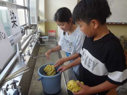 しかし、ただ邪魔者扱いするのではなく、「自然から色をいただく」という考え方をもとに活動をされている方に来ていただき、草木染の体験をさせていただきました。きれいな色に染まった布を見て、植物のもつ色や植物の活用に興味をもつことができました。
