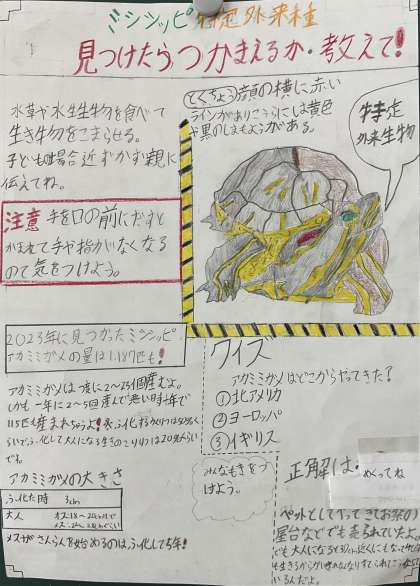 児童たちは、外来生物が生態系に与える影響や、私たちにできることについて真剣に考えながら、図や写真、文字の大きさ、キャッチコピーなどを工夫してポスターを作成しました。調べ学習を通して、自然との関わり方や環境保全の大切さを改めて実感する貴重な時間となりました。