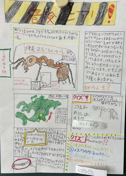 総合的な学習の時間に「桂坂自然調査隊」として身近な学校や地域の自然環境について調べる活動を行っています。今回は、私たちの身近に潜む「特定外来生物」について学び、調査した内容をポスターにまとめる活動に取り組みました。