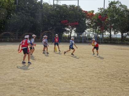 体育の学習では、タグラグビーをしています。4年生で1度学習をしていますが久しぶりのタグラグビーです。他のボール運動と違い、ボールを後ろに投げることや、タグを取られるとボールをパスしなければいけないなど、タグラグビーならではのルールがたくさんあります。