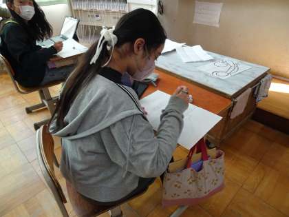 掃除をしている私。フラッグを振っている私。友だちと肩を組んでいる私。部活動のバトミントンをしている私。小学校生活最後の版画は、小学校での大切な思い出の1シーンです。まだまだ下書きの段階でこれからですが、もうすでに完成が楽しみです。