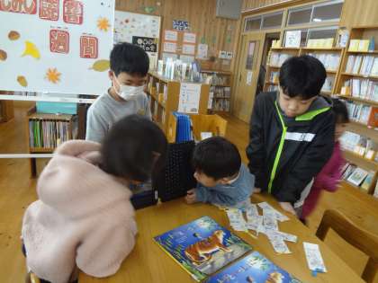 今日は、図書委員会による「本探しイベント」が行われました。イベントに参加してくれた低学年の子どもたちは、委員会の子が提示した本をラベルを目印に図書室を探し回っていました。