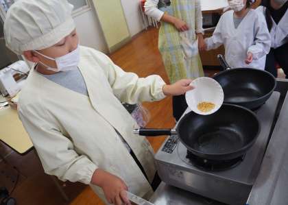 フライパンの中でポンッポンッとはじける音に、子どもたちはとてもわくわくした表情でした。