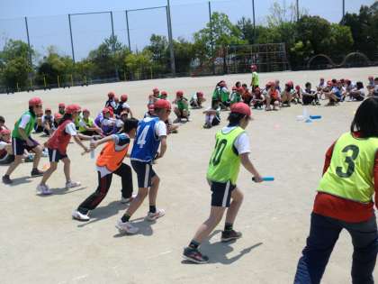 体育の学習で,春の学年リレーにむけての活動をしています。