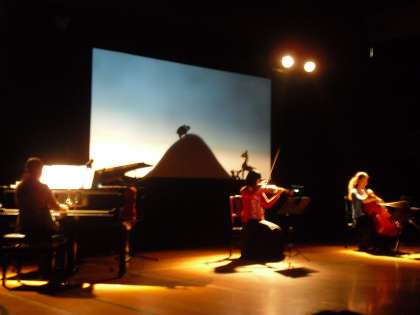 三重奏の生演奏や大きなスクリーンで見る影絵劇に,子ども達も魅了されていました。