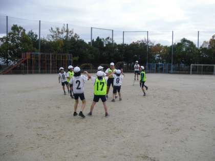 各チームで話し合いをして作戦を決めたり,パス練習をしたり,やさしい声をかけ合ったり…