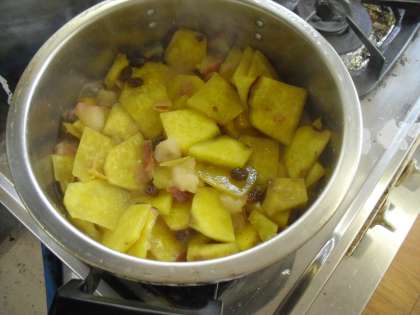 調理では,先生と一緒に包丁をもち,さつまいもとリンゴを切りました。包丁を使いなれている子も初めての子も,とてもドキドキしながら切っていました。レーズンと砂糖を一緒に入れて煮る時間にも,美味しい匂いがしてきます。もう子どもたちは早く食べたくてウズウズ,「早く!まだかな?」と待ちきれない様子でした。