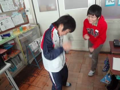 理科の学習で,コイル入り懐中電灯を振って発電させています。
