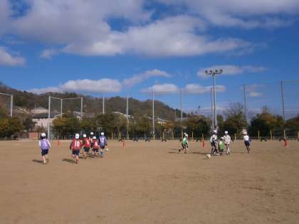 前学習のソフトバレーと同様,サッカーの学習でもチームでパスをつなぐことが大切です。