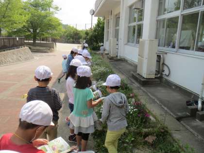 「この花なんやろう?」と,図鑑を使って調べたり,お花のにおいを嗅いだりと,熱心に取り組む姿が見られました。