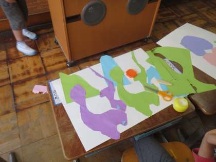 色画用紙を好きなように切り,その形から想像を広げて平面の作品を作っています。