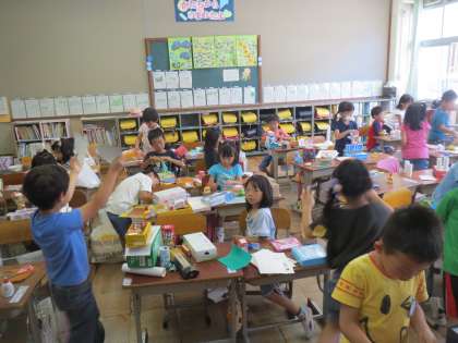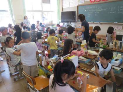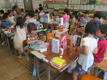 算数で使用した空き箱を使って,いろいろなものを作りました。