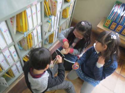 「こま回しは初めて!」という人が多く,意外と難しいひもをまきつける作業にくじけそうにもなりましたが,だんだんと上手く回せるようになってきました。
