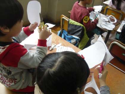 ハサミの使い方の勉強をしました。リンゴの形にきったり,うずまきにきったりと,線からはみ出さないように子ども達は,慎重にハサミを使っていました。