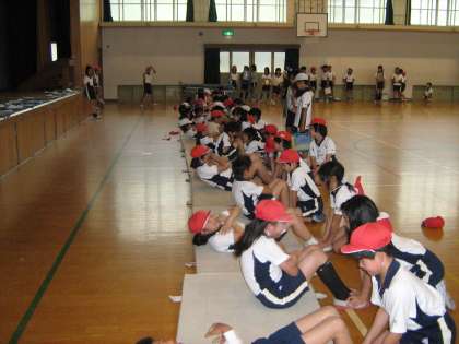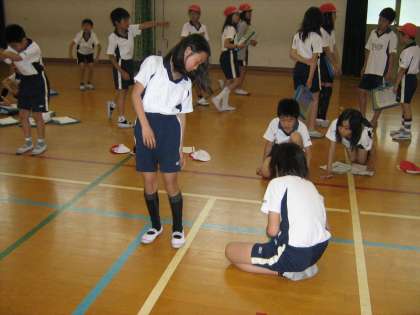 ソフトボール投げや上体起こし、長座体前屈などを行い,測定しました。反復横とびなど初めて行うものもあり,ドキドキしながら子どもたちは測定していました。