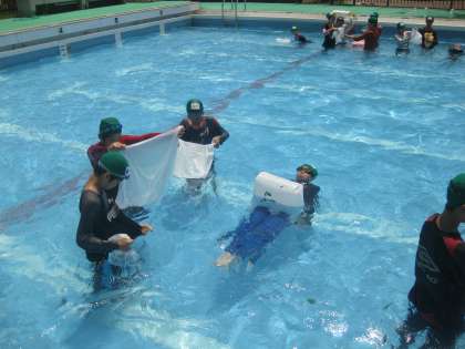 21日(火)に6年生が着衣泳をしました。海や川で水の事故に巻き込まれないように,衣服を着たままプールに入って,救助のされ方や身の周りのものを使って浮く方法を学びました。