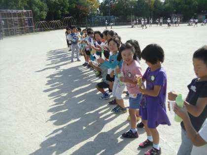 生活科の勉強で,マヨネーズやソースの入れ物に水を入れて,どれだけ水をとばせるかを競い合ったり,運動場に絵を描いたりして学習を進めました。遠くにとばしたり,上手じ描く方法を友達と相談していました。