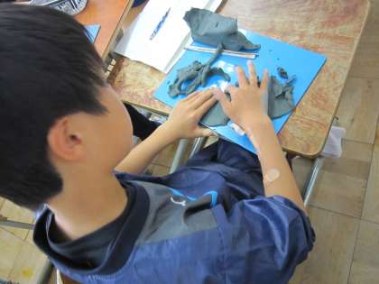 5年生の教室では「ねんどでデザイン」というテーマで粘土を使った学習に取り組んでいました。