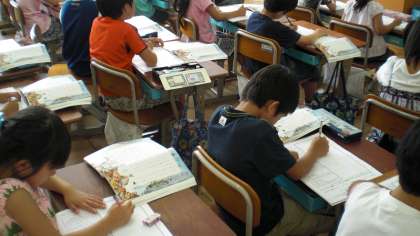 今日も朝から強い日差しが照りつける中,保護者のみなさんにご来校いただきました。2年生の国語は「スイミー」を学習しています。レオ=レオニー作の楽しい作品です。スイミーの勇気ある行動で仲間たちと大きな魚を追い出すというお話で,スイミーや赤い魚のペープサートを作り,赤い魚になったりスイミーに寄り添ったりしながら学習を進めています。「読む」「話す・聞く」「書く」力を場面の学習を通して育てていきたいと考えています。