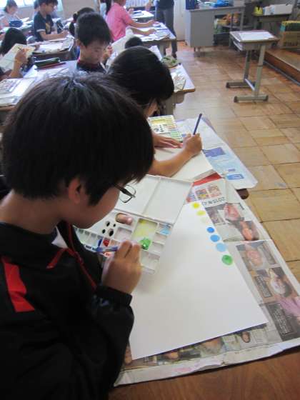 5年生は,図工の時間に三原色と白を使っての色づくりに取り組んでいました。