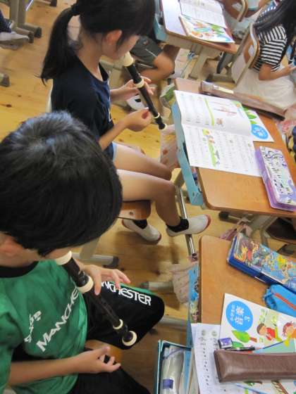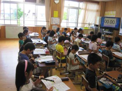 3年1組では,リコーダーで高い方の「ド」の練習に取り組んでいました。