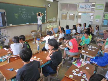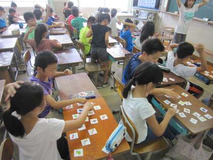ALTの先生が,英語で「バナナ」というとその言葉の絵が描かれたカードをとるというゲームを通して英語に親しんでいました。時々,絵カードにない言葉を言ってお手付きを誘いながら,英語と絵を関連付けて覚えられるようにしていました。