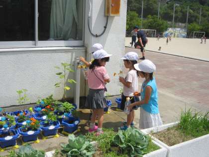中間休み,アサガオに水やりをしている子たちがいました。