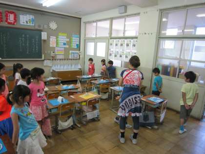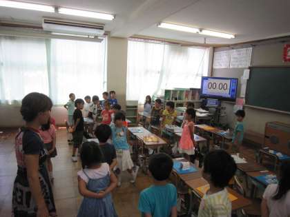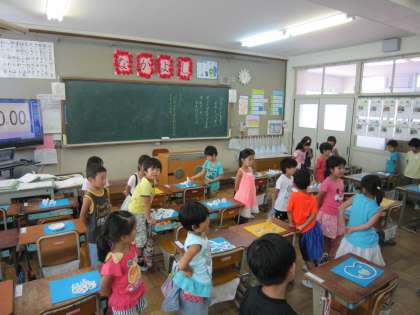 1年1組では,「ひもひもねんど」で作った作品の鑑賞会をしていました。