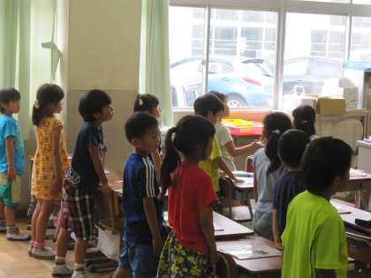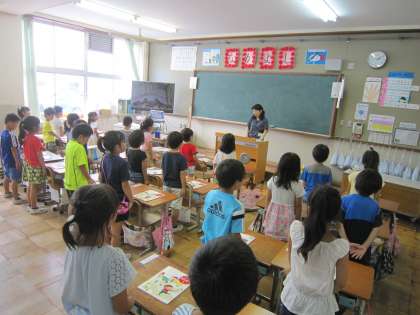 1年4組では,音楽の時間の初めに「うみ」という歌をみんなで歌っていました。