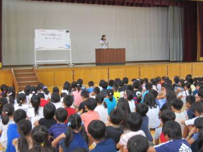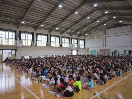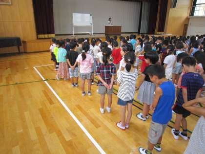 まず学校長より「体育館に入って変わったことに気づいた人はいますか?」という問いかけがありました。この休み中に体育館の床の改修工事を行いました。たくさんの子どもたちがきれいになった床に気づいていました。きれいな床を保つために大切に使ってほしいと思います。