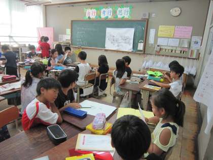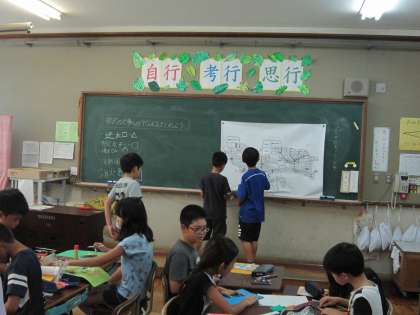 4年4組では,社会科で校区の火事への備えを調べています。総帥口や防火水槽,消火器などについて調べた結果を地図に書き込んでいました。