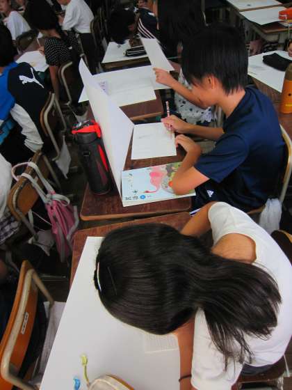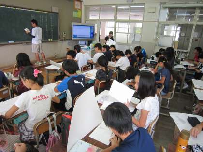 6年2組では,「選ばれた猫が水面に浮かびあがる」というお話を絵にしようとしています。描けそうな場面について確かめたあと,下絵に取りかかりました。