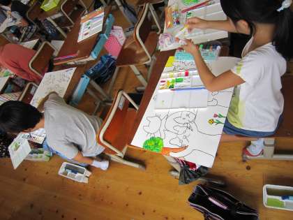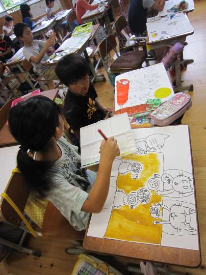 3年1組では,「まんげつの夜 どかんのねこのあしがいっぽん」というお話を絵にしようとしていました。