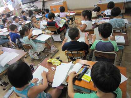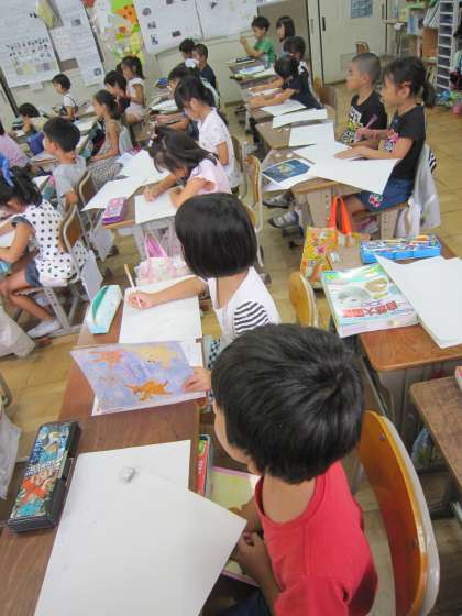 2年3組では,「いいもの みーつけた」というお話を聞いて心に残った場面を絵にしていました。