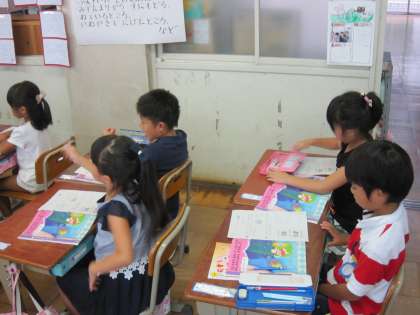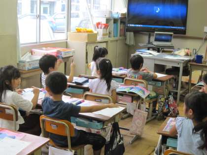1年4組では,音楽の時間に「ようすをおもいうかべてきこう」という学習をしていました。