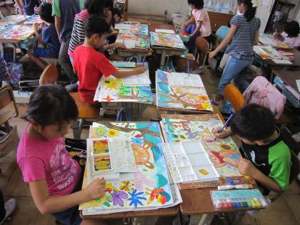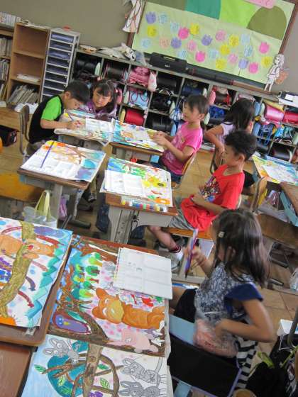 今日は,2組と3組が図工時間にお話の絵の仕上げに取り組んでいました。