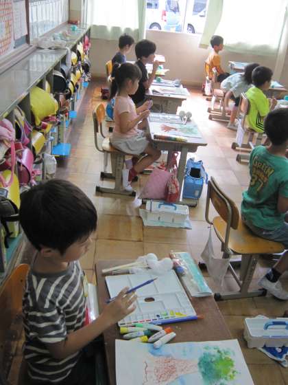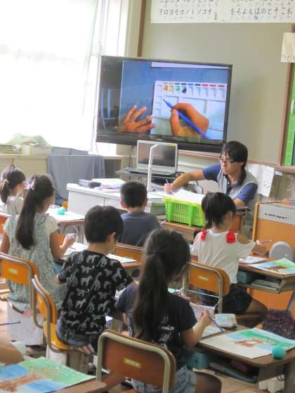 1年2組では,「えのぐでくさをかこう」というめあてで学習していました。