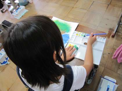 絵の具の使い方をみんなで確かめながら,草を描こうとしていました。