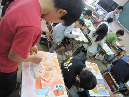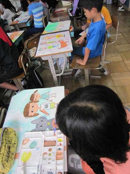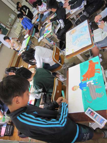 5年3組では,お話の絵に取り組んでいます。「捨て犬・未来と捨てネコ・未来」というお話を絵にしています。