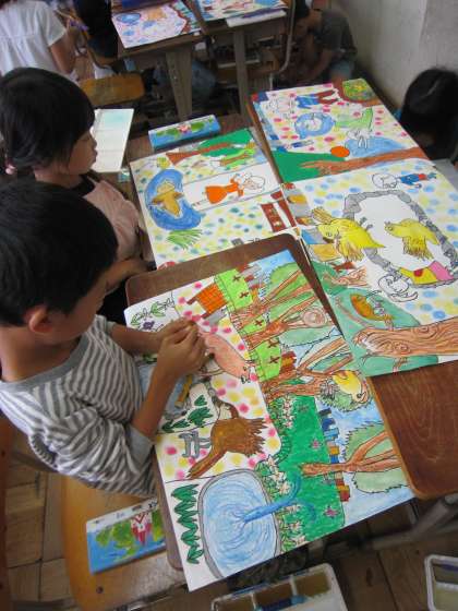 2年2組では,「ことりのみずあび」というお話を絵にしようとしています。