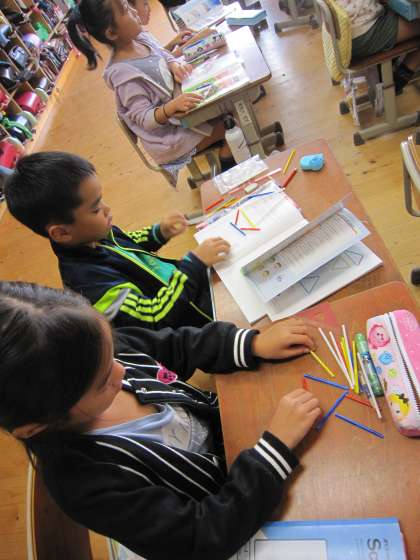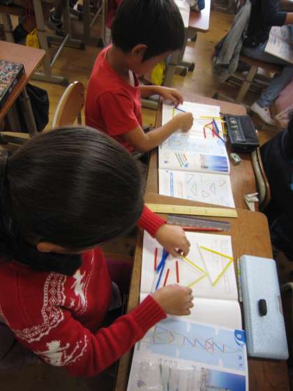 子どもたちは,手渡されたストローでいろいろな三角形を作っていました。