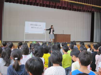 そしてその後,“かつらざかキッズ”の三つ目『相手を笑顔にする言葉づかいをしよう。』について,「笑顔にする言葉づかいとは,どんな言葉づかいだろう?」をみんなで考えました。「あいさつやお礼,相手をほめる『言葉』はもちろん,普段会話をしている時の『言葉づかい』が大切。」と全校みんなで確認する機会になりました。